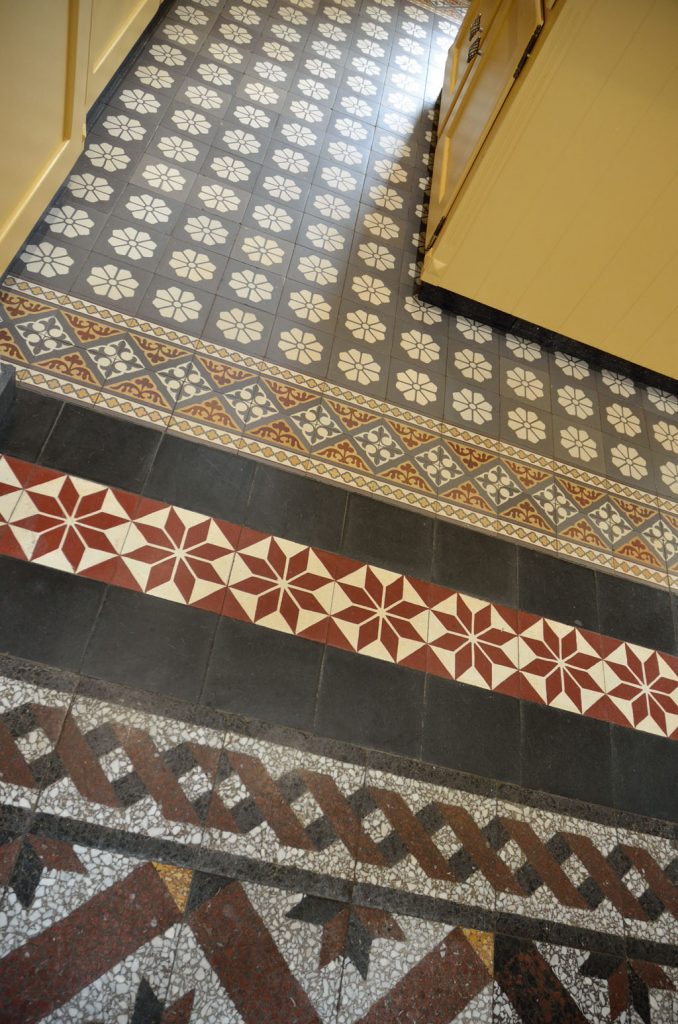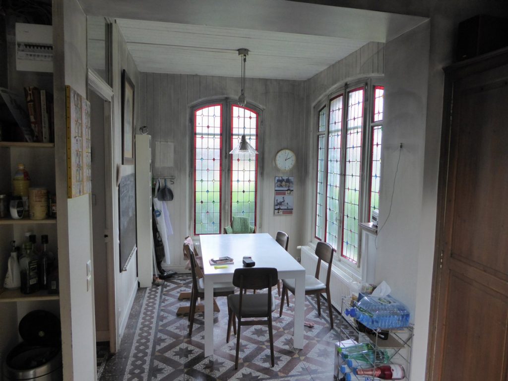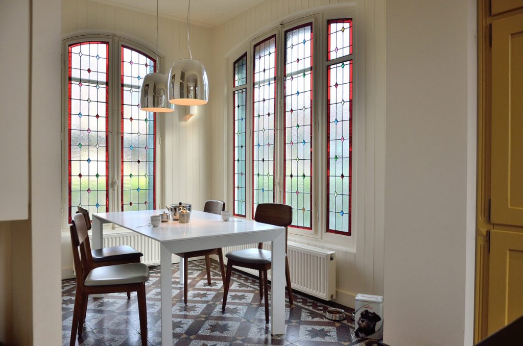 Dans l’espace dîner, profitant de la remise aux normes électriques, deux appliques murales discrètes et peintes dans la couleur des murs ainsi que deux suspensions miroirs viennent occuper le volume, réduisant visuellement la hauteur impressionnante sous plafond pour un côté plus intimiste. L’effet miroir permet d’oublier les suspensions mettant l’accent sur le reflet des vitraux qui font le charme de cet espace et qui ont été remis en état lors des travaux.