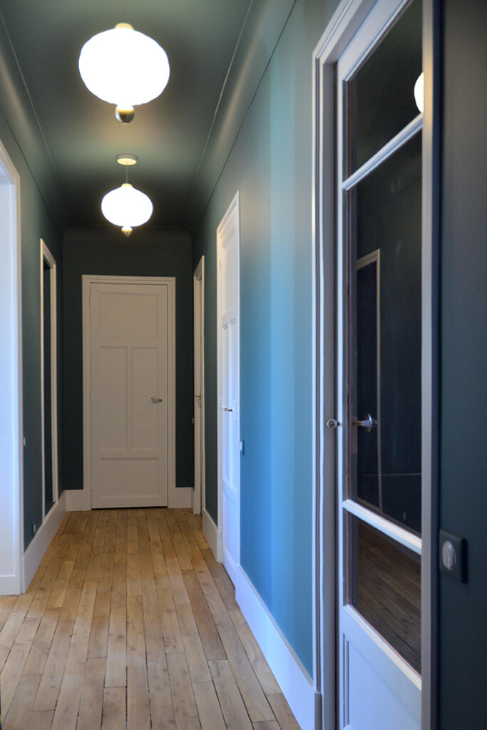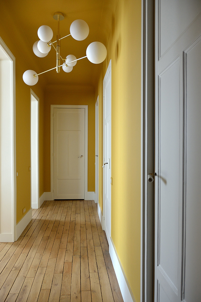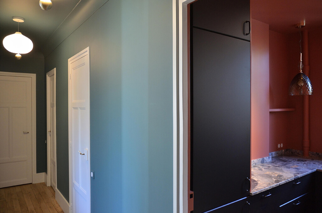 Dans le second appartement, l’ancien passage simple porte situé en extrémité du couloir a été condamné côté salon afin de permettre d’adosser un canapé, tandis que côté couloir l’ancien ébrasement du passage condamné permet de recevoir des étagères pour une bibliothèque dans le souci d’optimiser au mieux le besoin de rangement.