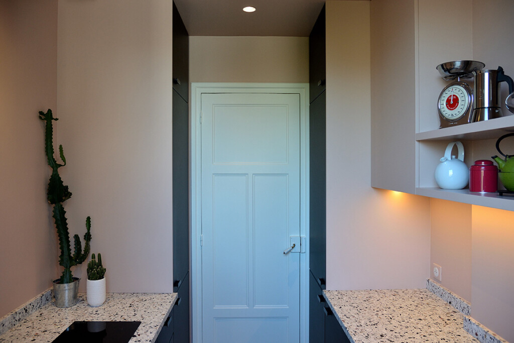 Par contre, dans la seconde cuisine, on trouve un lave-vaisselle de 45cm de largeur en lieu et place du lave-linge dans le projet précédent, et des rangements hauts intégrant une hotte encastrable. Des rangements indispensables à la cliente pour palier les besoins plus conséquents de stockage. Le lave-linge occupe quant à lui le bas d’une colonne située derrière la porte et intégrant un ballon d’eau-chaude plat disposé au-dessus avec des étagères démontables et réglables en hauteur devant ce dernier pour optimiser encore une fois les rangements.