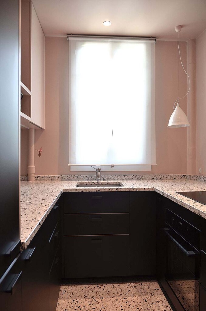 Si la configuration entre les deux appartements semble identique au premier regard, elle n’intègre pour autant pas tout à fait les mêmes éléments. Dans la cuisine en Terrazzo, la propriétaire a choisi de ne pas avoir recours à un lave-vaisselle, ni à une hotte de cuisine afin de garder visuellement le maximum de volume libre entre le plan de travail et le plafond pour une plus grande sensation d’espace.